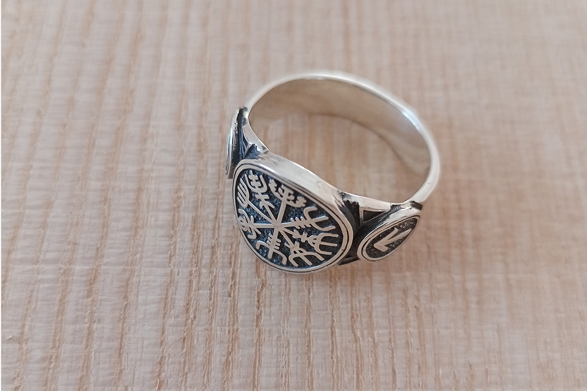 Кольцо с руническим компасом Вегвизир и рунами Тейваз (Тюр) - Путь Воина